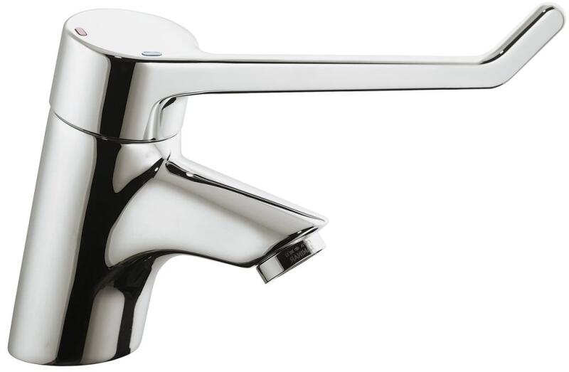 -függőleges mosdókagyló-keverő meghosszabbított fogantyúval- fogantyú hossza 180 mm- kerámiafejes típusú Cycle szelep vízhőmérséklet-korlátozóval és antilegionnel funkcióval-a nyitás/zárás és a meleg/hideg víz szabályozása a fogantyú egy síkban történő mozgatásával - pCA lamináris levegőztető M24x1 vandálbiztos- sPX G3/8 csatlakozótömlők- fém fogantyú- eASY-FIX rozsdamentes acél szerelőrendszer- automatikus vízzáró nélkül- szín króm