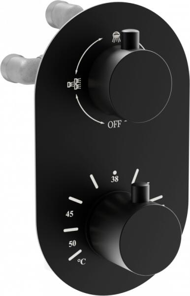 MEXEN KAI - 3-KIMENETŰ REJTETT ZUHANYAKKUMULÁTOR, fekete, 77602-70 leírás Anyaga: sárgaréz Szabályozás: termosztatikus Kivitel: fekete Csaptelep típusa: rejtett kapcsolóval, 2 kimenetű, termosztatikus keverő beleértve a rejtett testet is