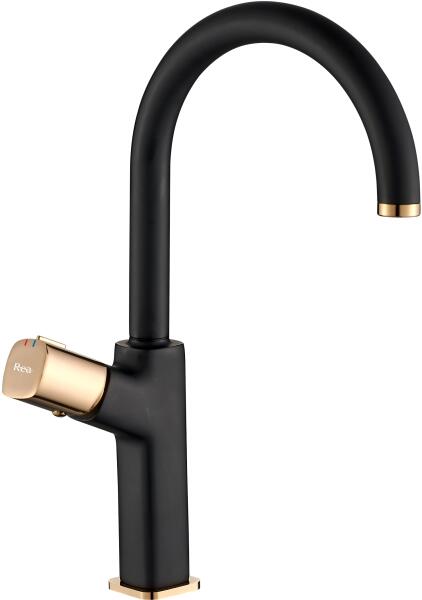 REA SALTO - Magas mosdócsaptelep, fekete, REA-B6351 A Rea Salto mosdó csaptelep hatékony kiegészítője a fürdőszobának vagy a konyhának. Klasszikus forma modern változatban. A matt fekete színt arany kiegészítőkkel kombinálták. Az egyik pozíció lehetővé teszi a víz hőmérsékletének gyors és pontos beállítását az Ön igényei szerint. A termék magassága 355 mm, míg a kimeneti tartomány 170 mm. A csaptelep sérülésálló sárgarézből készült, feje kerámia. Műszaki adatok Csaptelep típusa: mosdó, mosogató Az csaptelep beépítési módja: munkalap, mosdó Anyaga: sárgaréz Csaptelep felülete: matt fekete, arany Patron típusa: kerámia Az csaptelep magassága 355 mm Kimeneti tartomány 170 mm Csatlakozási átmérő: 3/8 hüvelyk